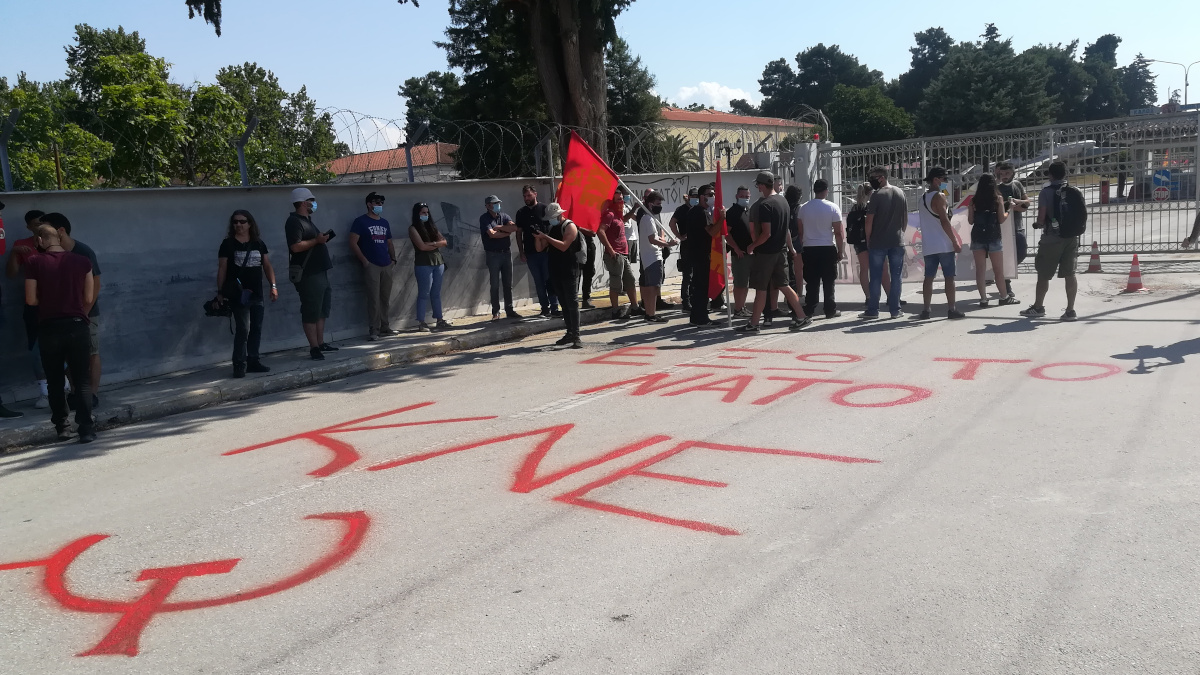 «Έξω οι βάσεις και το ΝΑΤΟ – Ούτε γη ούτε νερό στους φονιάδες των λαών» έγραφε το πανό με υπογραφή ΚΝΕ, ενώ στο δρόμο μπροστά στην πύλη της αεροπορικής βάσης οι διαδηλωτές έγραψαν με σπρέι το σύνθημα «Έξω το ΝΑΤΟ».