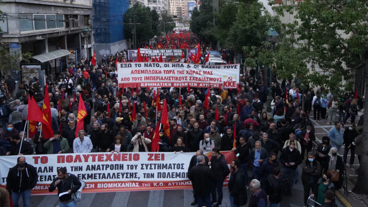 «Στους δρόμους του ανυποχώρητου αγώνα, με το λαό πρωταγωνιστή! Έτσι κερδίζεται το δίκιο! Έτσι γράφεται η Ιστορία!» το σύνθημα που δεσπόζει στα μπλοκ του ΚΚΕ και της ΚΝΕ.
