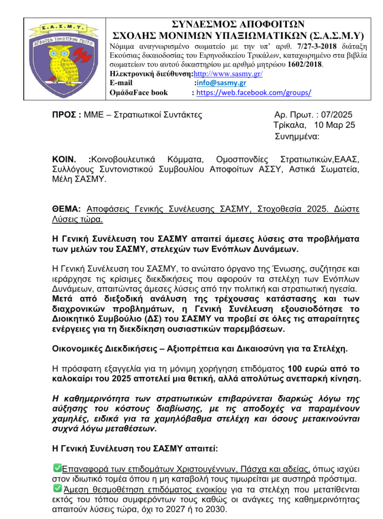 “Καταθέτουμε ΑΝΑΦΟΡΑ τις αποφάσεις της Γενικής Συνέλευσης του Συνδέσμου Αποφοίτων Σχολής Μόνιμων Υπαξιωματικών (Σ.Α.Σ.Μ.Υ), με τις οποίες απαιτούν άμεσες λύσεις στα προβλήματα των μελών του ΣΑΣΜΥ, στελεχών των Ενόπλων Δυνάμεων”.