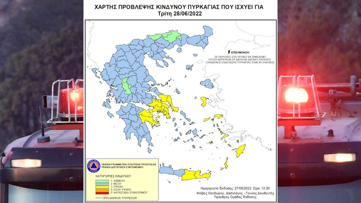 Σύμφωνα με τον Χάρτη Πρόβλεψης Κινδύνου Πυρκαγιάς που εκδίδει η Γενική Γραμματεία Πολιτικής Προστασίας, για σήμερα, Τρίτη 28 Ιούνη προβλέπεται υψηλός κίνδυνος πυρκαγιάς ( επίπεδο 3) σε: