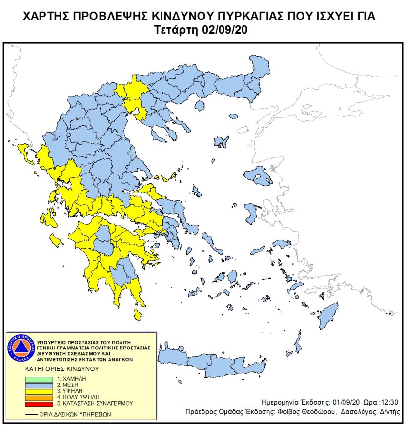 Σύμφωνα με το Χάρτη Πρόβλεψης Κινδύνου Πυρκαγιάς που εκδίδει η Γενική Γραμματεία Πολιτικής Προστασίας, για σήμερα Τετάρτη 2/9 προβλέπεται υψηλός κίνδυνος σε:
