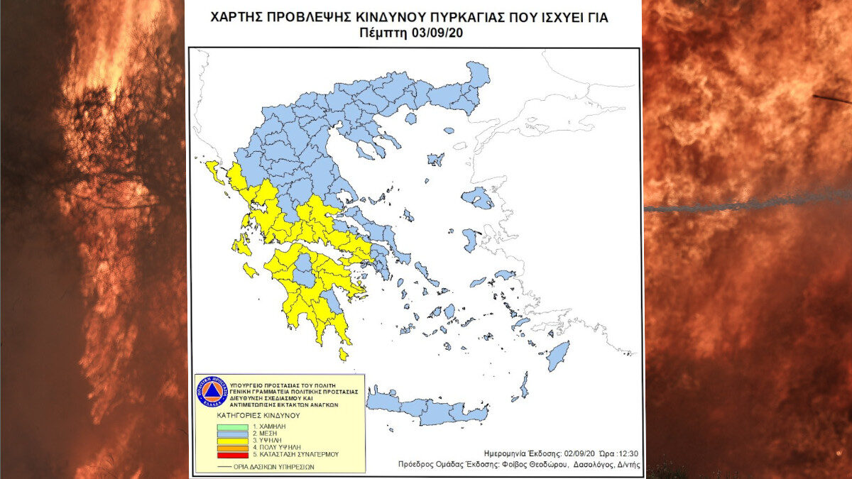Σύμφωνα με τον Χάρτη Πρόβλεψης Κινδύνου Πυρκαγιάς της Γενικής Γραμματείας Πολιτικής Προστασίας για σήμερα Πέμπτη 03.09.20, προβλέπεται υψηλός κίνδυνος πυρκαγιάς σε: