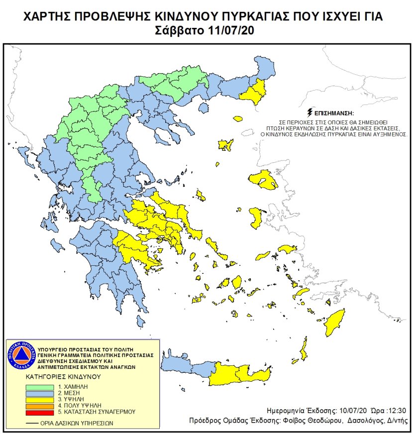 Σύμφωνα με το Χάρτη Πρόβλεψης Κινδύνου Πυρκαγιάς που εκδίδει η Γενική Γραμματεία Πολιτικής Προστασίας για σήμερα, Σάββατο 11/07, προβλέπεται υψηλός κίνδυνος πυρκαγιάς (κατηγορία κινδύνου 3) σε Αττική, Αν. Στερεά Ελλάδα, Κορινθία, Αργολίδα, Έβρο, Β. & Ν. Αιγαίο & Κρήτη