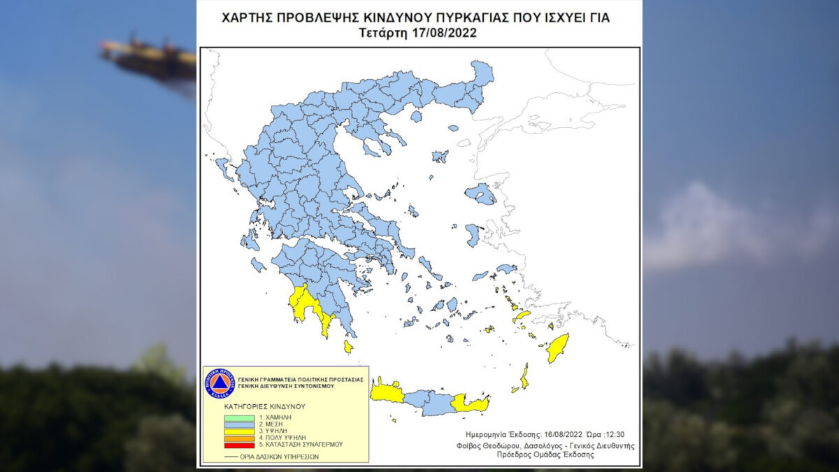 Σύμφωνα με το Χάρτη Πρόβλεψης Κινδύνου Πυρκαγιάς που εκδίδει η Γενική Γραμματεία Πολιτικής Προστασίας του Υπουργείου Κλιματικής Κρίσης & Πολιτικής Προστασίας, για σήμερα Τρίτη 16 Αυγούστου 2022, προβλέπεται υψηλός κίνδυνος πυρκαγιάς (κατηγορία κινδύνου 3 και άνω) σε Δωδεκάνησα, Χανιά και Λασίθι, σε περιοχές της Μεσσηνίας, της Λακωνίας και στα Κύθηρα.