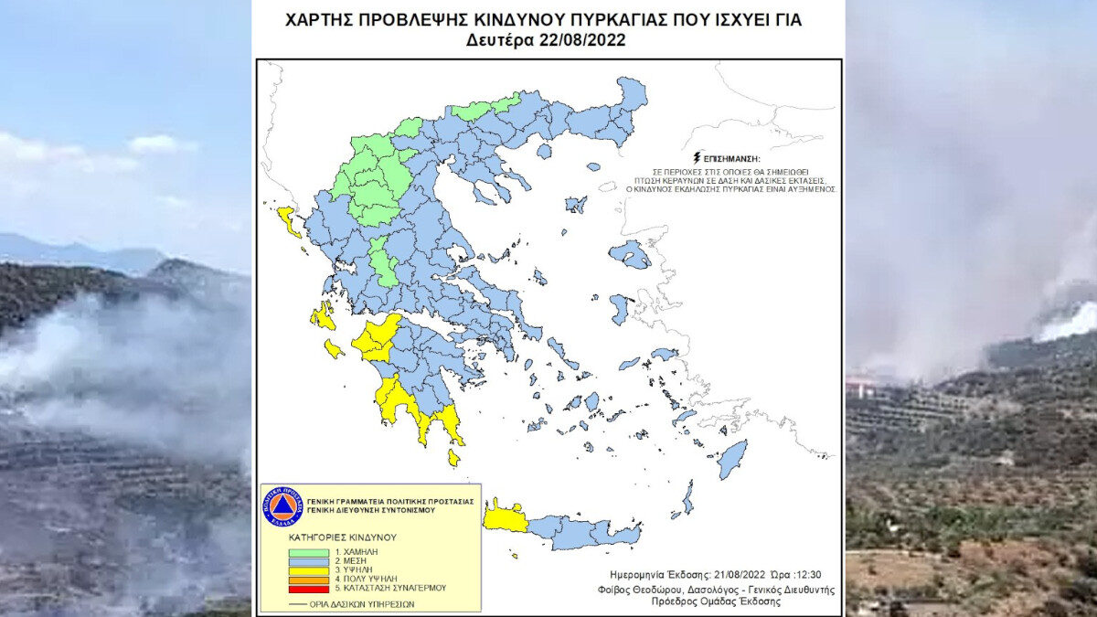 Σύμφωνα με το Χάρτη Πρόβλεψης Κινδύνου Πυρκαγιάς που εκδίδει η Γενική Γραμματεία Πολιτικής Προστασίας του Υπουργείου Κλιματικής Κρίσης & Πολιτικής Προστασίας, για σήμερα Δευτέρα 22 Αυγούστου 2022, προβλέπεται υψηλός κίνδυνος πυρκαγιάς (κατηγορία κινδύνου 3) για τις εξής περιοχές: