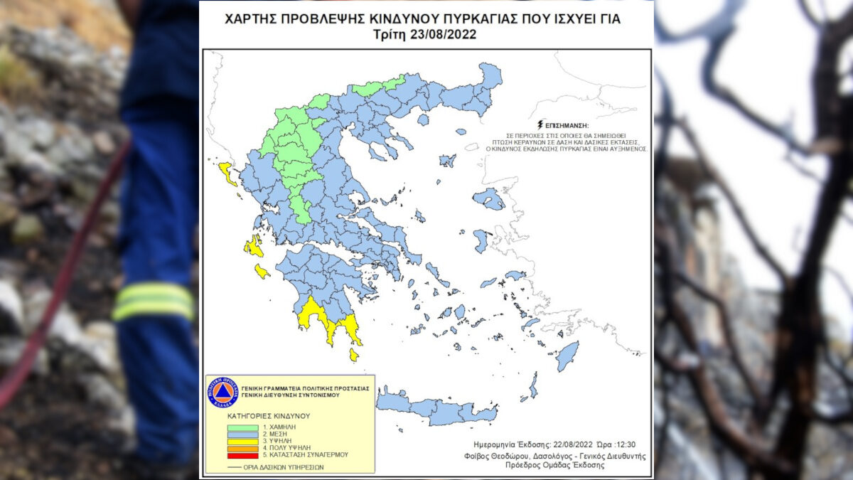 Σύμφωνα με το Χάρτη Πρόβλεψης Κινδύνου Πυρκαγιάς που εκδίδει η Γενική Γραμματεία Πολιτικής Προστασίας του Υπουργείου Κλιματικής Κρίσης & Πολιτικής Προστασίας, για σήμερα Τρίτη 23 Αυγούστου 2022, προβλέπεται υψηλός κίνδυνος πυρκαγιάς (κατηγορία κινδύνου 3) για τις εξής περιοχές: