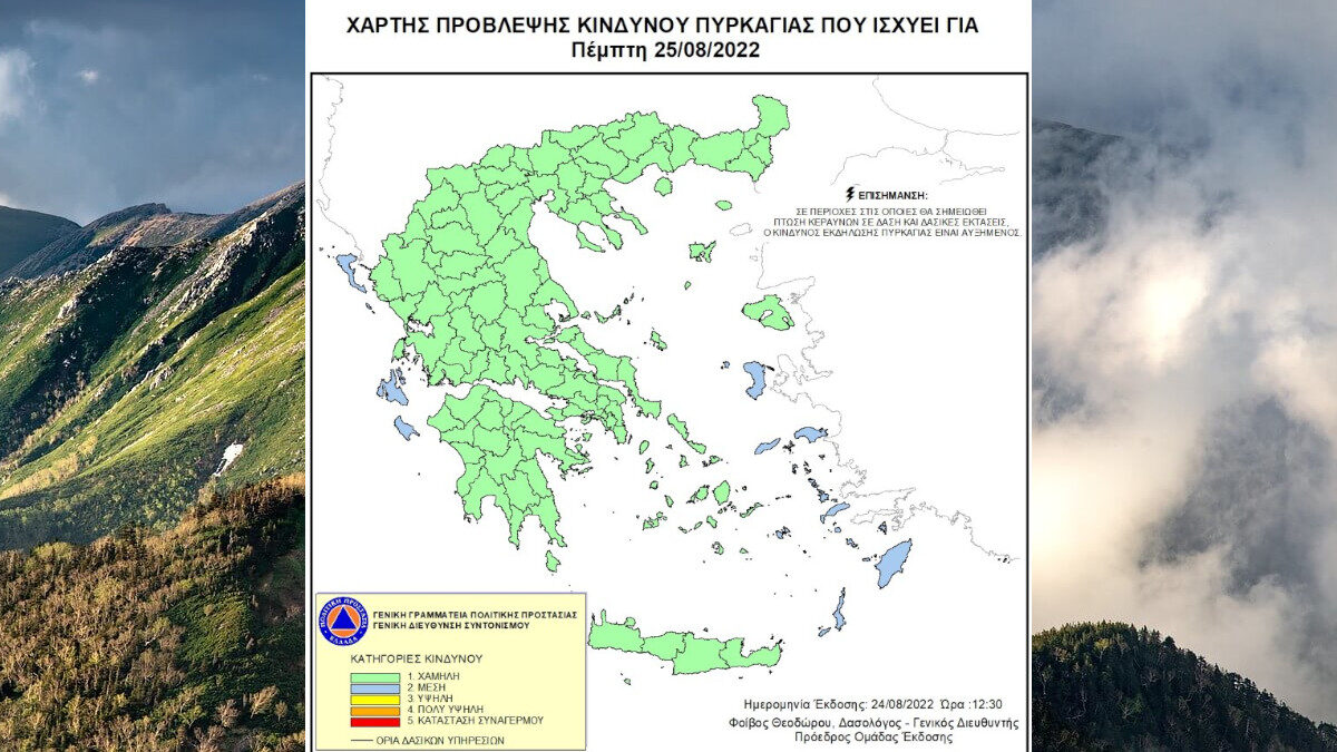 Σύμφωνα με το Χάρτη Πρόβλεψης Κινδύνου Πυρκαγιάς που εκδίδει η Γενική Γραμματεία Πολιτικής Προστασίας του Υπουργείου Κλιματικής Κρίσης & Πολιτικής Προστασίας, για σήμερα Πέμπτη 25 Αυγούστου 2022, δεν προβλέπεται υψηλός κίνδυνος πυρκαγιάς για καμία περιοχή της χώρας.