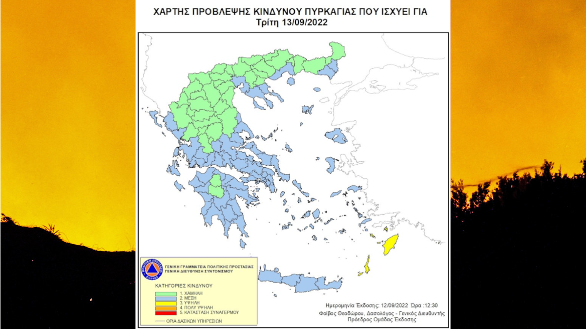 Ο Χάρτης Πρόβλεψης Κινδύνου Πυρκαγιάς που εκδίδεται από τη Γενική Γραμματεία Πολιτικής Προστασίας του Υπουργείου Κλιματικής Κρίσης & Πολιτικής Προστασίας, για σήμερα, Τρίτη 13 Σεπτέμβρη 2022, προβλέπει υψηλό κίνδυνο πυρκαγιά ( επίπεδο 3) για τη νήσο Ρόδο και Κάρπαθο.