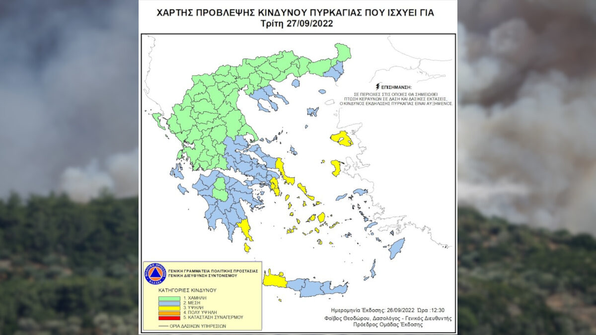Ο Χάρτης Πρόβλεψης Κινδύνου Πυρκαγιάς που εκδίδεται από τη Γενική Γραμματεία Πολιτικής Προστασίας του Υπουργείου Κλιματικής Κρίσης & Πολιτικής Προστασίας, για σήμερα, Τρίτη 27 Σεπτέμβρη 2022 (27/09/2022), προβλέπει υψηλό κίνδυνο πυρκαγιάς για περιοχές της Αττικής, Κυθήρων, νότιας Εύβοιας και Λακωνίας, στις Κυκλάδες, τα Χανιά, τη Λέσβο, τη Χίο και τα Ψαρά.