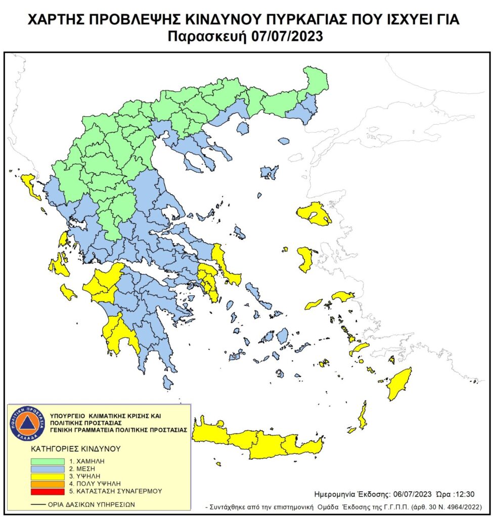 Ο Χάρτης Πρόβλεψης Κινδύνου Πυρκαγιάς που εκδίδεται για σήμερα, Παρασκευή 7 Ιουλίου από τη Γενική Γραμματεία Πολιτικής Προστασίας του Υπουργείου Κλιματικής Κρίσης & Πολιτικής Προστασίας, προβλέπεται υψηλός κίνδυνος εκδήλωσης πυρκαγιάς ( κατηγορία 3) για περιοχές της Εύβοιας, του ν. Αττικής, των Επτανήσων – πλην Λευκάδας, περιοχών της Αχαΐας, Ηλείας και της Μεσσηνίας, της Κρήτης, των Δωδεκανήσων, της Λέσβου, της Χίου, της Σάμου και της Ικαρίας. Στην υπόλοιπη επικράτεια προβλέπεται χαμηλή ή μέση επικινδυνότητα εκδήλωσης πυρκαγιάς.