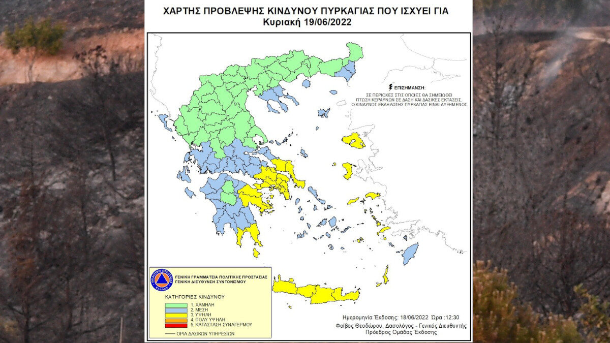 Χάρτης Πρόβλεψης Κινδύνου Πυρκαγιάς για σήμερα, Κυριακή 19 Ιούνη