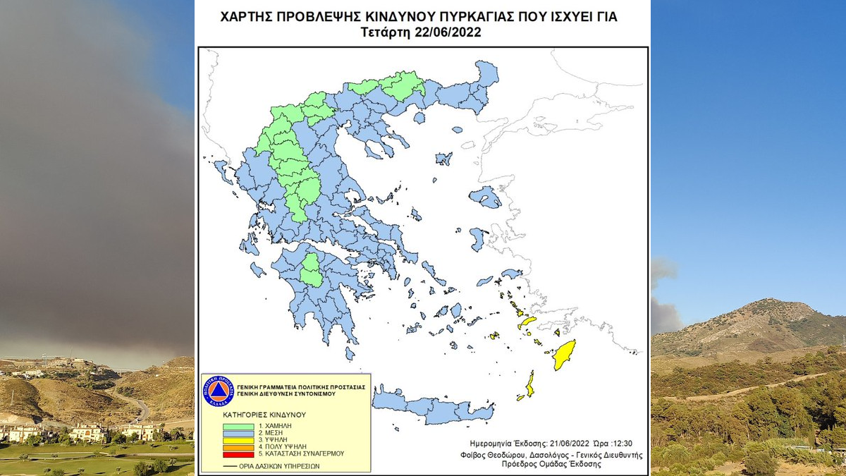 Σύμφωνα με τον Χάρτη Πρόβλεψης Κινδύνου Πυρκαγιάς που εκδίδει η Γενική Γραμματεία Πολιτικής Προστασίας για σήμερα, Τετάρτη 22 Ιούνη προβλέπεται υψηλός κίνδυνος πυρκαγιάς (επίπεδο 3) για την περιοχή των Δωδεκανήσων.