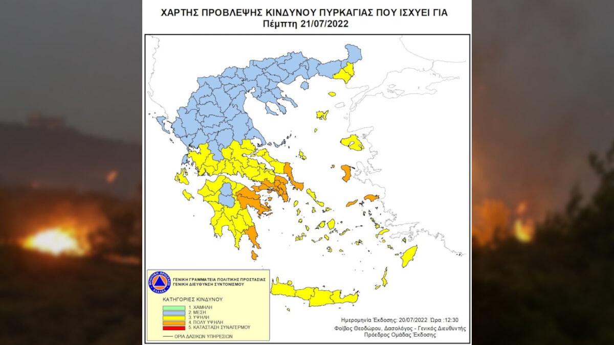 Ο Χάρτης Πρόβλεψης Κινδύνου Πυρκαγιάς που εκδίδεται από τη Γενική Γραμματεία Πολιτικής Προστασίας, για σήμερα Τετάρτη 20/07/2022 προβλέπει: