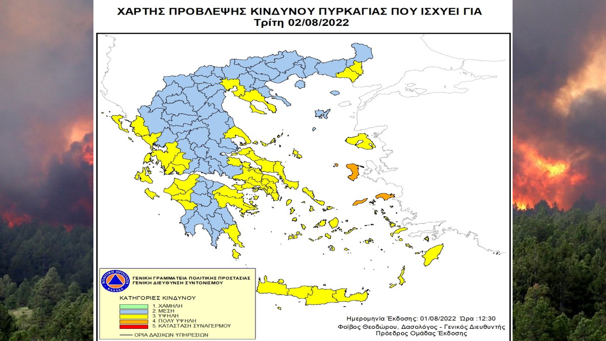 Σύμφωνα με το Χάρτη Πρόβλεψης Κινδύνου Πυρκαγιάς που εκδίδει η Γενική Γραμματεία Πολιτικής Προστασίας του Υπουργείου Κλιματικής Κρίσης & Πολιτικής Προστασίας, για σήμερα Τρίτη 02 Αυγούστου 2022, προβλέπεται πολύ υψηλός κίνδυνος πυρκαγιάς (κατηγορία κινδύνου 4) για τις εξής περιοχές: