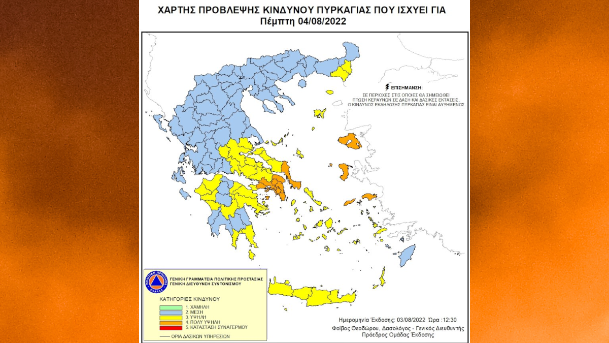 Σύμφωνα με το Χάρτη Πρόβλεψης Κινδύνου Πυρκαγιάς που εκδίδει η Γενική Γραμματεία Πολιτικής Προστασίας του Υπουργείου Κλιματικής Κρίσης & Πολιτικής Προστασίας, για σήμερα Πέμπτη 04 Αυγούστου 2022, προβλέπεται πολύ υψηλός κίνδυνος πυρκαγιάς (κατηγορία κινδύνου 4) για τις εξής περιοχές: