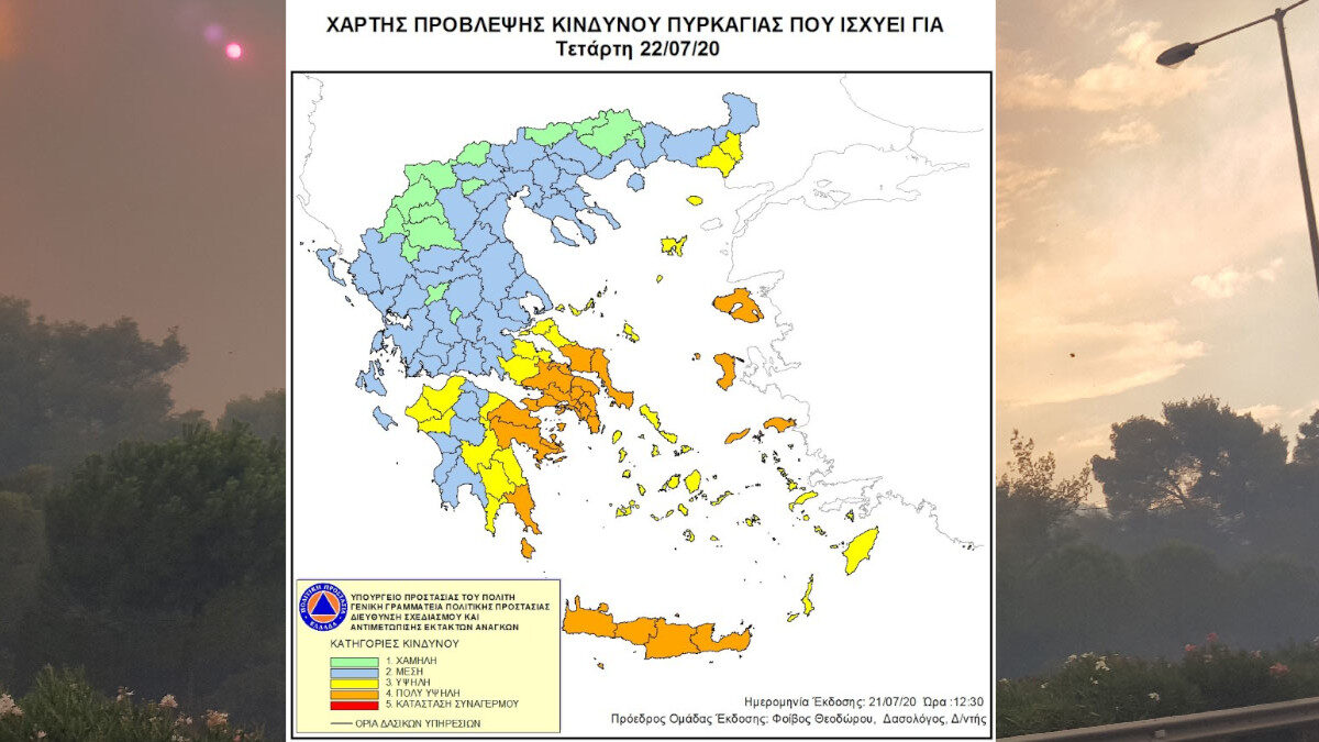 Σύμφωνα με το Χάρτη Πρόβλεψης Κινδύνου Πυρκαγιάς που εκδίδει η Γενική Γραμματεία Πολιτικής Προστασίας για σήμερα, Τετάρτη 22 Ιουλίου 2020, προβλέπεται πολύ υψηλός κίνδυνος πυρκαγιάς (κατηγορία κινδύνου 4) σε Αττική, Κύθηρα, Εύβοια, Βοιωτία, Κορινθία, Αργολίδα, Λακωνία, Κρήτη, Λέσβο, Χίο, Σάμο & Ικαρία.