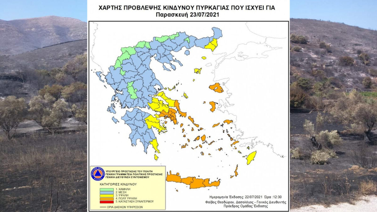 Σύμφωνα με το Χάρτη Πρόβλεψης Κινδύνου Πυρκαγιάς που εκδίδει η Γενική Γραμματεία Πολιτικής Προστασίας, για σήμερα Σάββατο 24 Ιουλίου 2021, προβλέπεται πολύ υψηλός κίνδυνος πυρκαγιάς (κατηγορία κινδύνου 4) για τις εξής περιοχές: