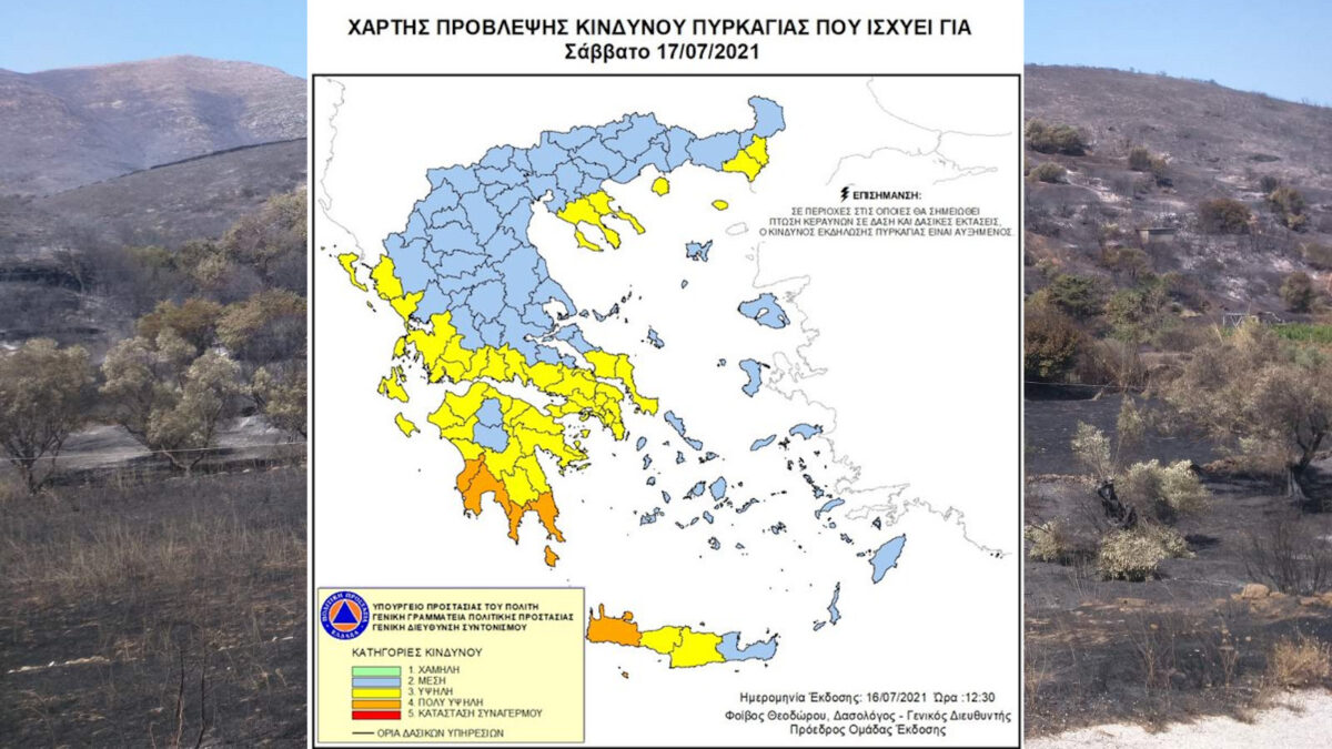 Σύμφωνα με το Χάρτη Πρόβλεψης Κινδύνου Πυρκαγιάς που εκδίδει η Γενική Γραμματεία Πολιτικής Προστασίας, για σήμερα Κυριακή 25 Ιουλίου 2021, προβλέπεται πολύ υψηλός κίνδυνος πυρκαγιάς (κατηγορία κινδύνου 4) για τις εξής περιοχές: