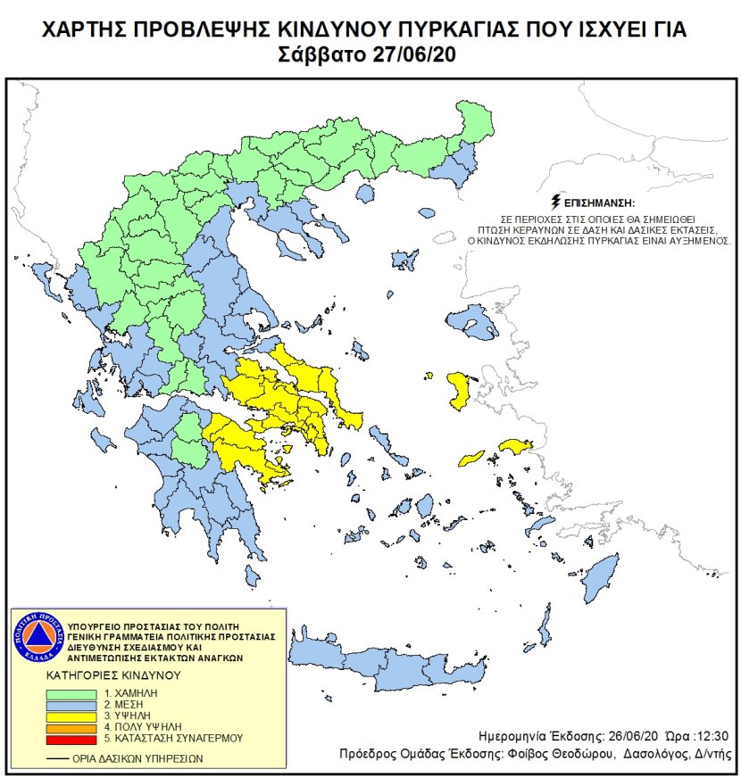 Σύμφωνα με το Χάρτη Πρόβλεψης Κινδύνου Πυρκαγιάς που εκδίδει η Γενική Γραμματεία Πολιτικής Προστασίας για αύριο Σάββατο 27 Ιουνίου 2020, προβλέπεται υψηλός κίνδυνος πυρκαγιάς (κατηγορία κινδύνου 3) σε Αττική, Βοιωτία, Φθιώτιδα, Κόρινθο, Αργολίδα, Εύβοια, Σάμο, Χίο και Ικαρία.