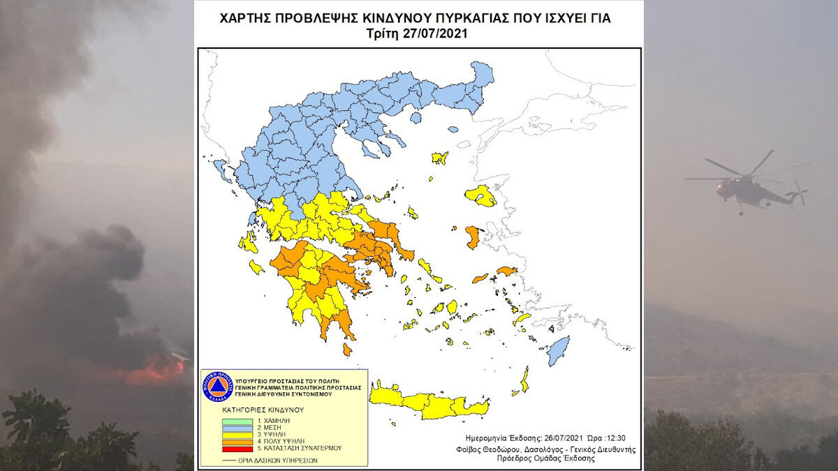 Σύμφωνα με το Χάρτη Πρόβλεψης Κινδύνου Πυρκαγιάς που εκδίδει η Γενική Γραμματεία Πολιτικής Προστασίας, για σήμερα Τετάρτη 28 Ιουλίου 2021, προβλέπεται πολύ υψηλός κίνδυνος πυρκαγιάς (κατηγορία κινδύνου 4) για τις εξής περιοχές:
