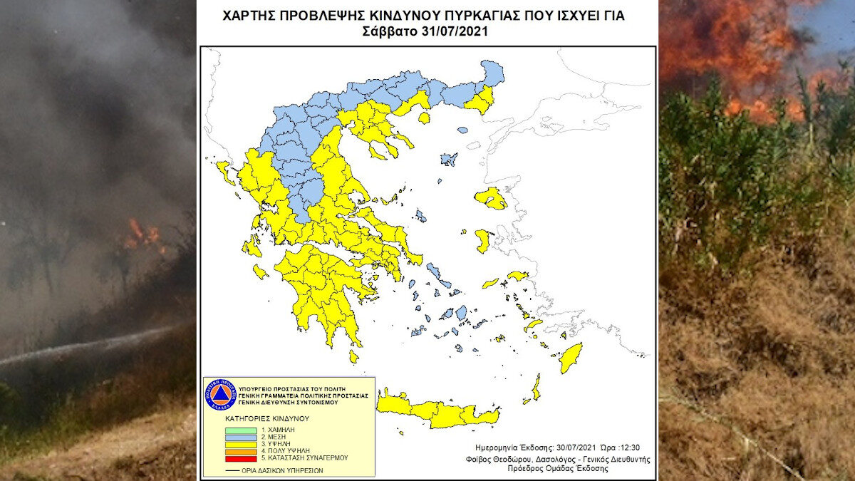 Σύμφωνα με το Χάρτη Πρόβλεψης Κινδύνου Πυρκαγιάς που εκδίδει η Γενική Γραμματεία Πολιτικής Προστασίας, για σήμερα Σάββατο 31 Ιουλίου 2021, προβλέπεται υψηλός κίνδυνος πυρκαγιάς (κατηγορία κινδύνου 3) για τις εξής περιοχές: