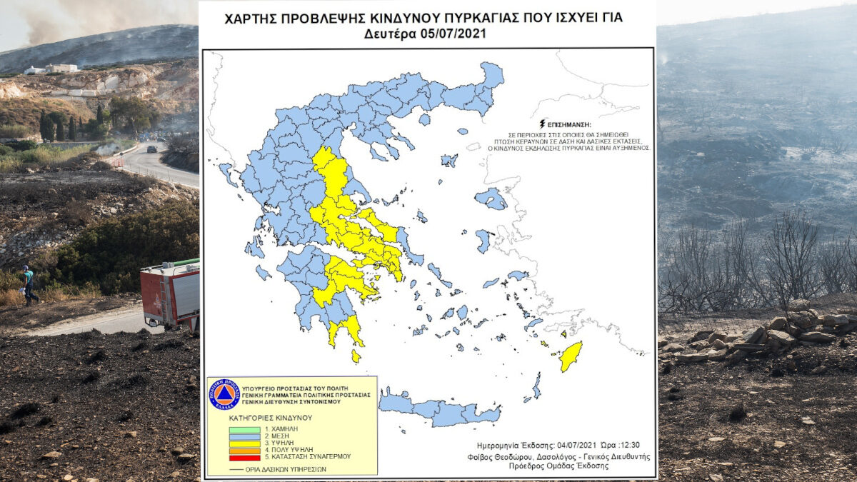 Χάρτης Πρόβλεψης Κινδύνου Πυρκαγιάς της Γενικής Γραμματείας Πολιτικής Προστασίας για σήμερα Δευτέρα 5/7/21 προβλέπει: