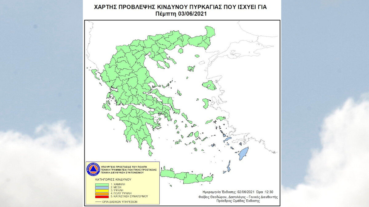 Σύμφωνα με τον χάρτη πρόβλεψης κινδύνου Πυρκαγιάς που εκδίδει η Γ.Γ. Πολιτικής Προστασίας σήμερα 3/6/21 προβλέπεται χαμηλός και μέσος κίνδυνος σε όλη την επικράτεια.