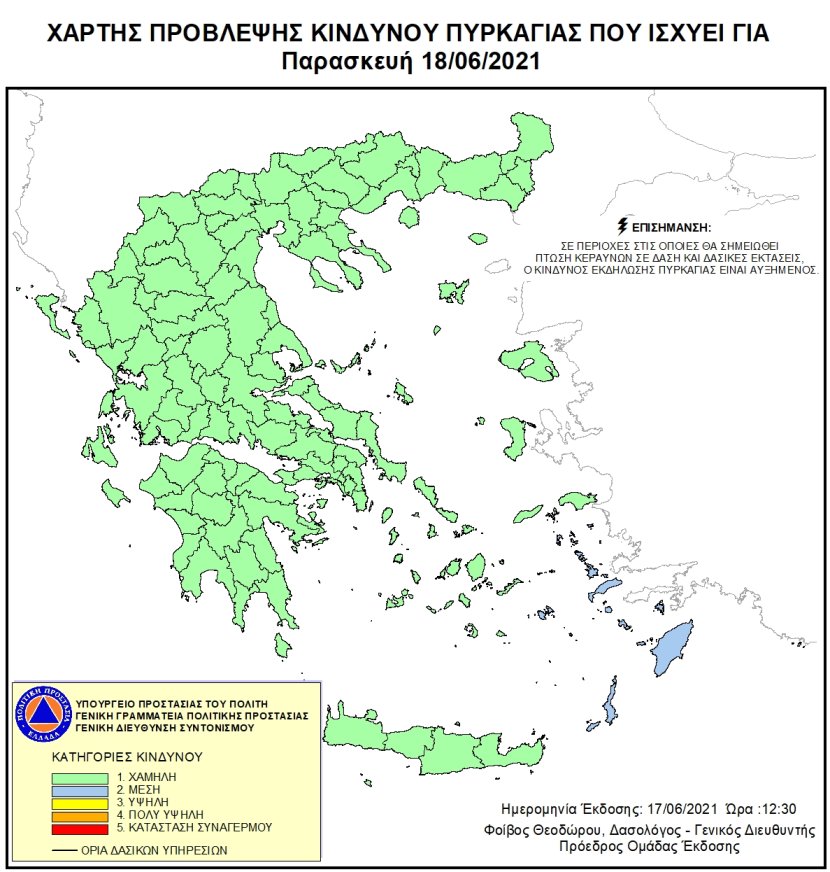 Χάρτης Πρόβλεψης Κινδύνου Πυρκαγιάς της Γενικής Γραμματείας Πολιτικής Προστασίας που ισχύει για σήμερα, Παρασκευή 18 Ιουνίου 2021.