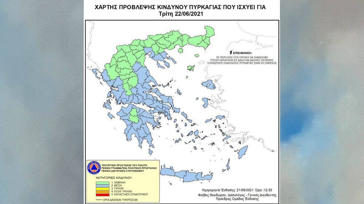 Χάρτης Πρόβλεψης Κινδύνου Πυρκαγιάς της Γενικής Γραμματείας Πολιτικής Προστασίας που ισχύει για σήμερα, Τρίτη 22 Ιουνίου 2021 (22/6/2021).