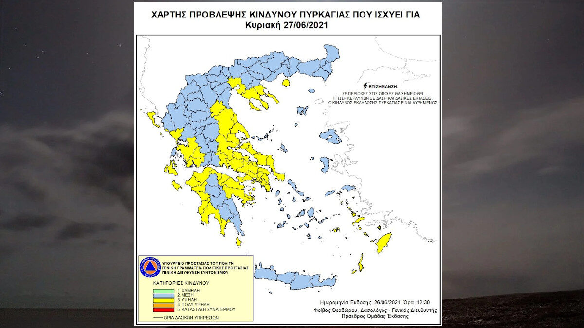 Σύμφωνα με τον Χάρτη Πρόβλεψης Κινδύνου Πυρκαγιάς που εκδίδει η Γενική Γραμματεία Πολιτικής Προστασίας, για σήμερα, Κυριακή 27 Ιουνίου, προβλέπεται υψηλός κίνδυνος πυρκαγιάς κατηγορίας 3 σε Αττική, Εύβοια και περιοχές Στ. Ελλάδας, Πελ/νήσου, Θεσσαλίας, Ηπείρου και Θεσσαλονίκης, Χαλκιδική, Θάσο, Δωδεκάνησα, Κύθηρα και σε νησιά Ιονίου.
