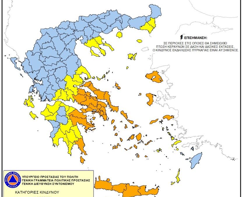 Σύμφωνα με τον Χάρτη Πρόβλεψης Κινδύνου Πυρκαγιάς που εκδίδει η Γενική Γραμματεία Πολιτικής Προστασίας υπάρχει κίνδυνος (επίπεδο 4) εκδήλωσης πυρκαγιάς στην Αττική, στα Κύθηρα, Εύβοια, Σκύρο καθώς και στα νησιά του Αιγαίου.