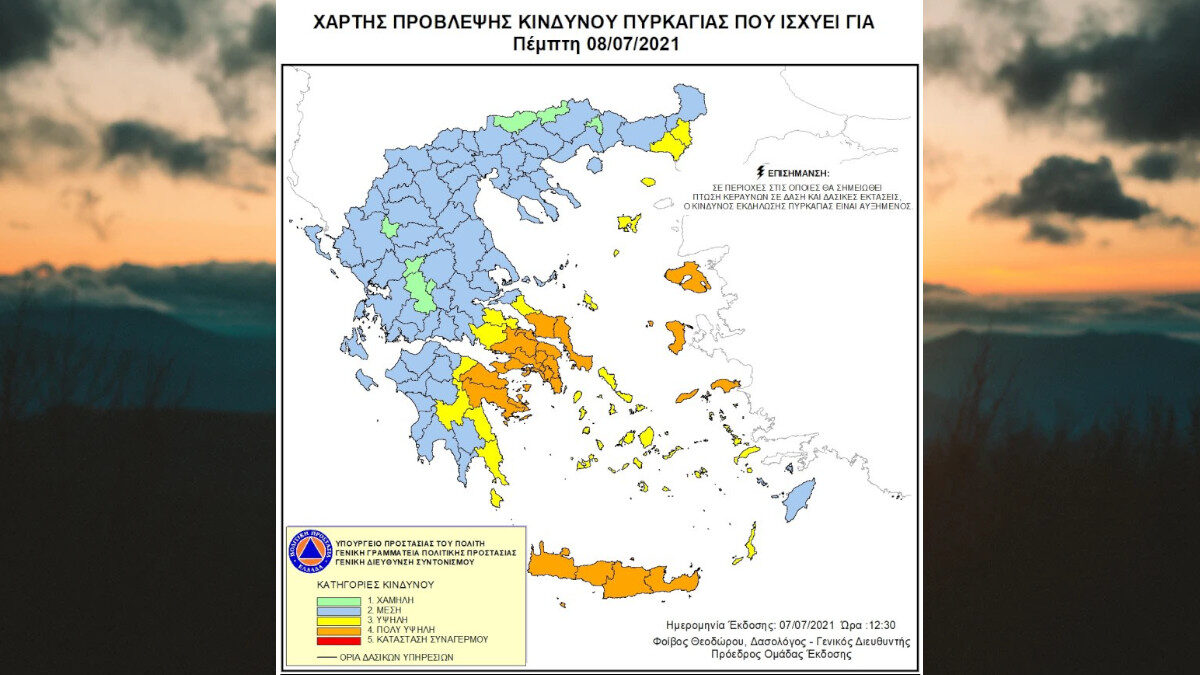 Χάρτης Πρόβλεψης Κινδύνου Πυρκαγιάς της Γενικής Γραμματείας Πολιτικής Προστασίας για σήμερα, Πέμπτη 8/7/21: