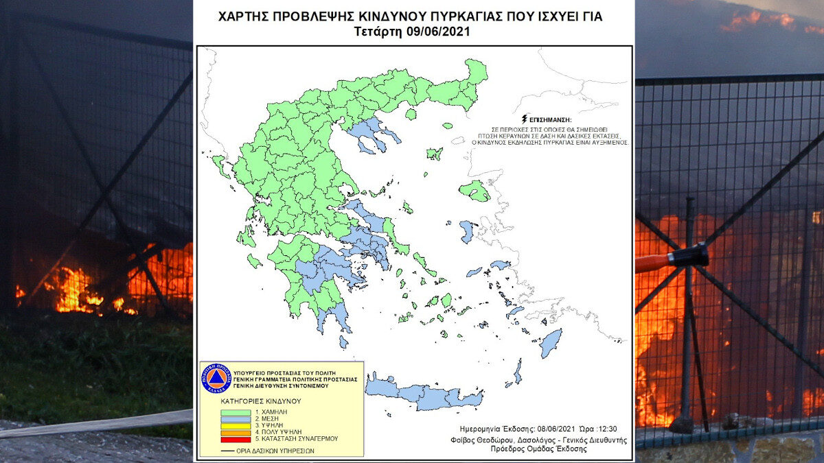 Χάρτης Πρόβλεψης Κινδύνου Πυρκαγιάς της Γενικής Γραμματείας Πολιτικής Προστασίας που ισχύει για σήμερα, Τετάρτη 9 Ιουνίου 2021.