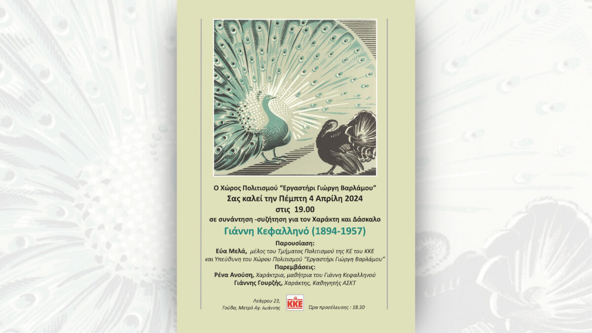 Ο Χώρος Πολιτισμού «Εργαστήρι Γιώργη Βαρλάμου» διοργανώνει την Πέμπτη 4 Απρίλη συνάντηση – συζήτηση για τον χαράκτη και δάσκαλο Γιάννη Κεφαλληνό (1894 – 1957), στις 7 μ.μ.