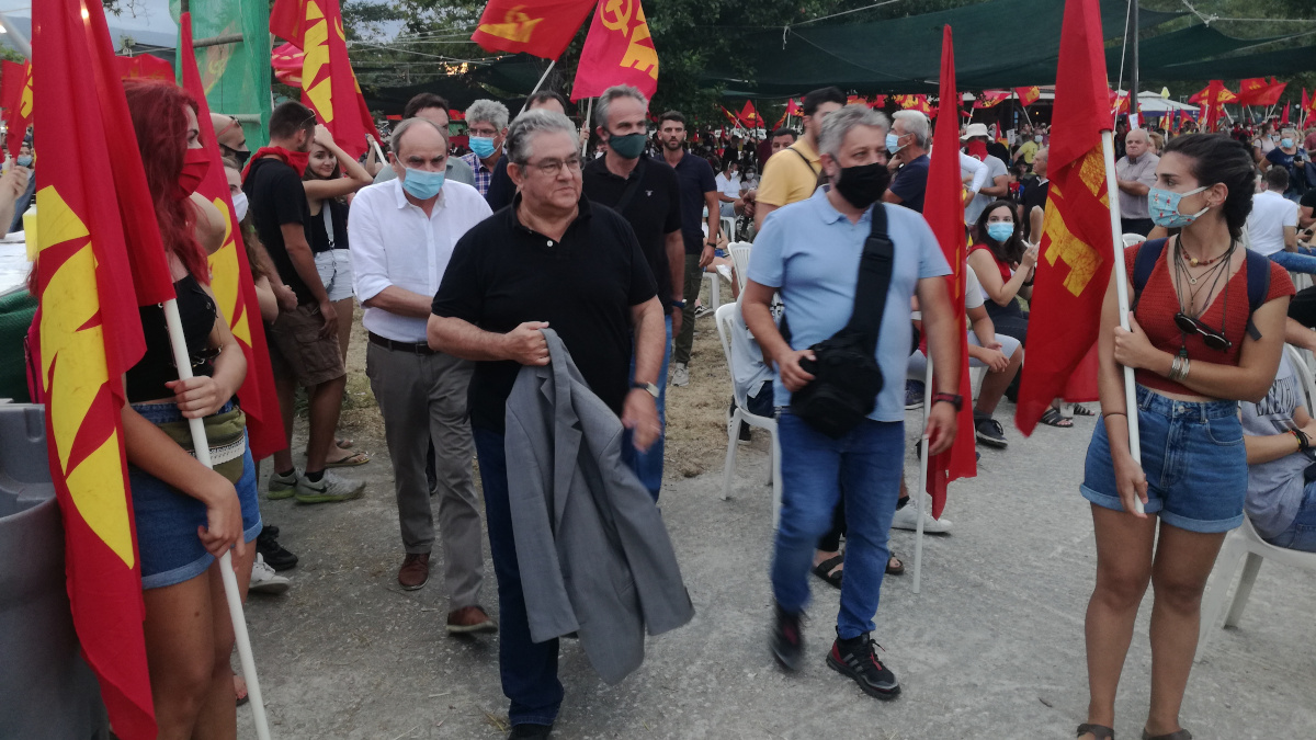 «Διεκδικούμε μέτρα προστασίας της ζωής και της υγείας του λαού μας δεν θα πληρώσουμε ξανά την κρίση τους, μένουμε δυνατοί, περνάμε στην αντεπίθεση,με το ΚΚΕ για τον σοσιαλισμό», ακούγεται από τα μεγάφωνα της κατασκήνωσης πριν την έναρξη της ομιλίας. «Ένας αιώνας αγώνας και θυσία, το ΚΚΕ στην πρωτοπορία», το σύνθημα με το οποίο υποδέχτηκαν στο βήμα οι κατασκηνωτές και οι επισκέπτες του Διημέρου, τον ΓΓ της ΚΕ του ΚΚΕ, Δημήτρη Κουτσούμπα, ο οποίος ανεβαίνοντας στο βήμα, τους χαιρέτησε με υψωμένη τη γροθιά.