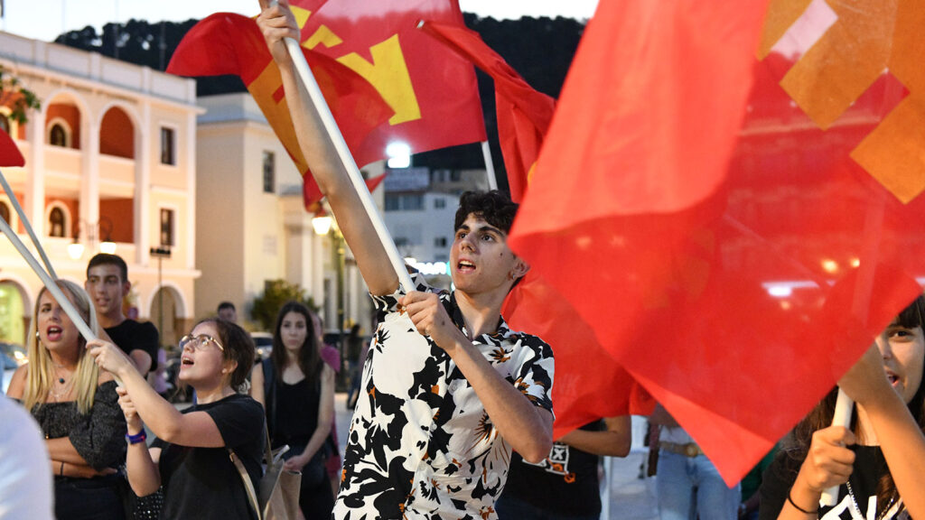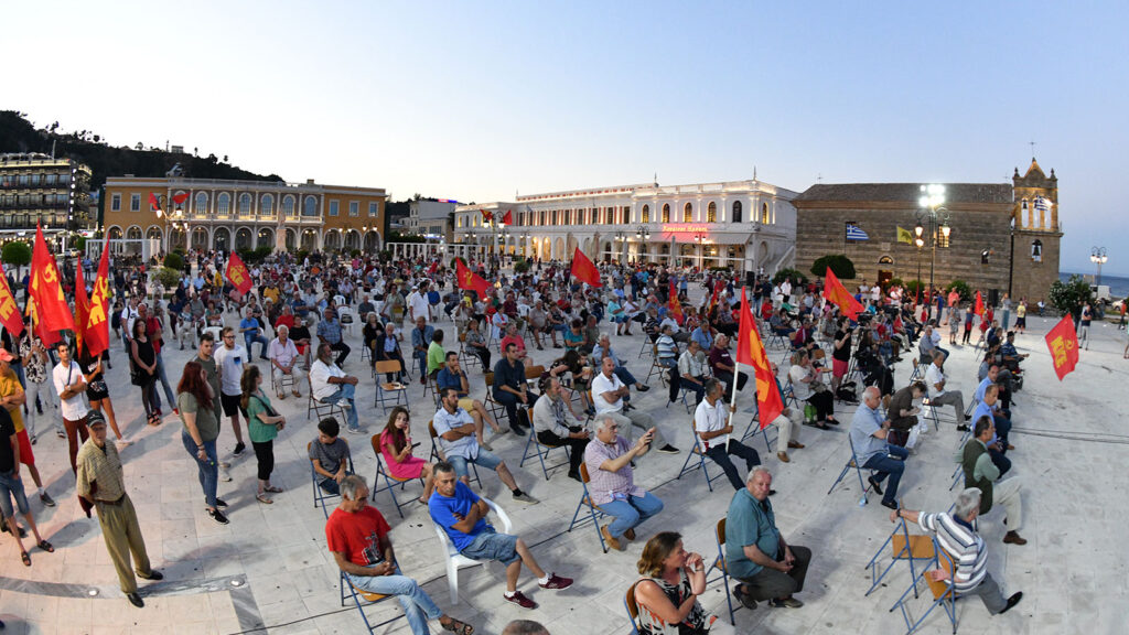 Σήμερα εδώ από τη Ζάκυνθο, εδώ σ’ αυτό το όμορφο νησί του Ιουνίου συζητάμε με τους εργάτες, τους άνεργους τους μικροεπαγγελματίες και τους φτωχούς αγρότες για το τι πρέπει να γίνει για να σηκωθούμε όλοι μαζί λίγο ψηλότερα, αφού ήδη βρισκόμαστε σε μια νέα φάση.