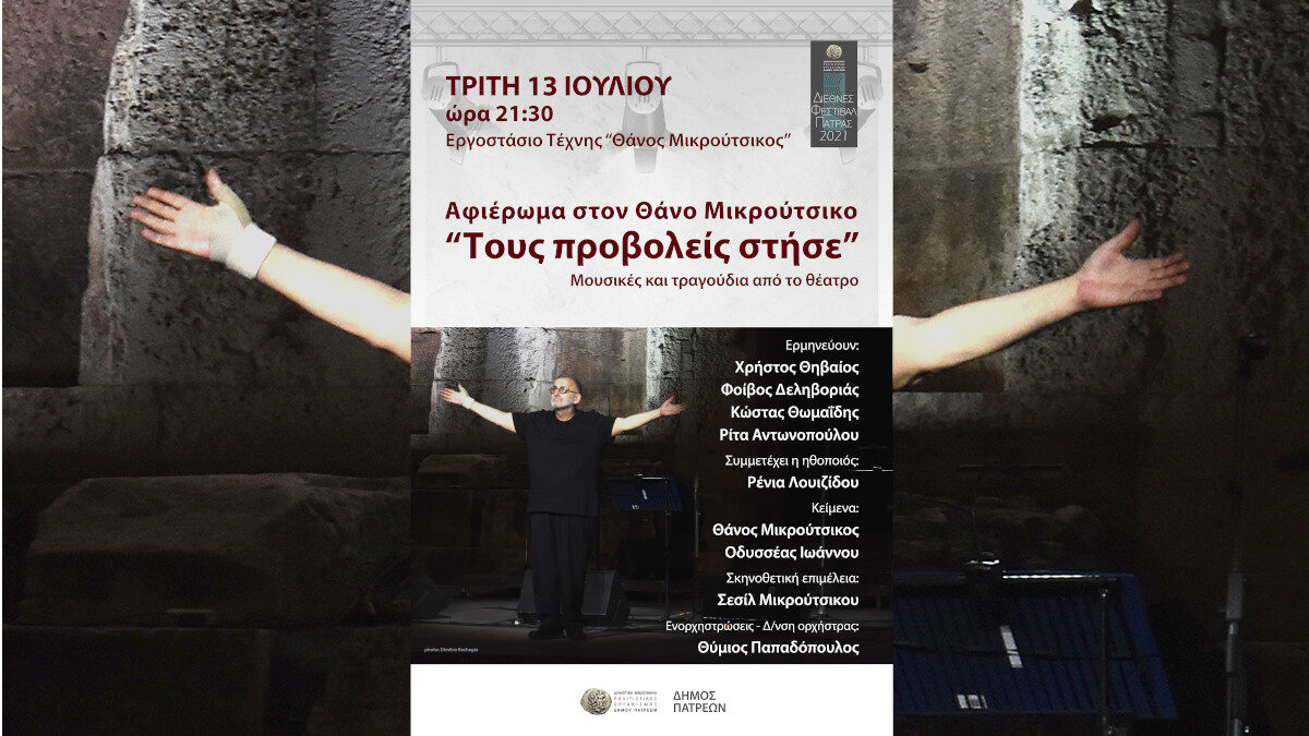 Τίτλος της παράστασης , που θα πραγματοποιηθεί στις 9.30 το βράδυ της Τρίτης 13 Ιουλίου στον υπαίθριο χώρο του Εργοστασίου Τέχνης «Θάνος Μικρούτσικος», «Τους προβολείς στήσε». Με την αυριανή συναυλία ολοκληρώνεται το φετινό αφιέρωμα του Διεθνούς Φεστιβάλ της Πάτρας στη μνήμη του Θάνου Μικρούτσικου. Είχε προηγηθεί την περασμένη Πέμπτη, με μοναδική επιτυχία, στα Παλαιά Δημοτικά Σφαγεία, η συναυλία «Τα μπλουζ του Θάνου», με το κοινό να κατακλύζει το χώρο.