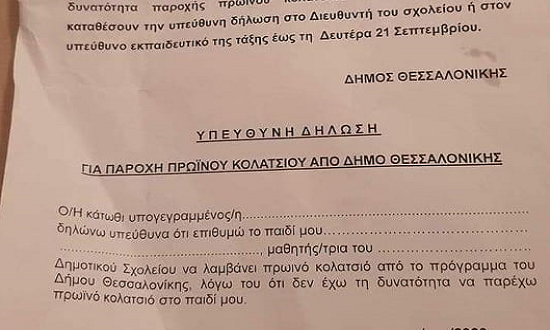 Δηλώνω υπεύθυνα πως αυτή η ανακοίνωση είναι η κατάντια ενός ανάλγητου κράτους που θέλει τους πολίτες να προσκυνούν τους δήθεν ελεήμονες που τους ζητούν υπεύθυνη δήλωση για ένα κολατσιό ενώ τους κόβουν το ρεύμα αν δεν εξοφλήσουν το λογαριασμό και αυξάνουν τα δημοτικά τέλη!