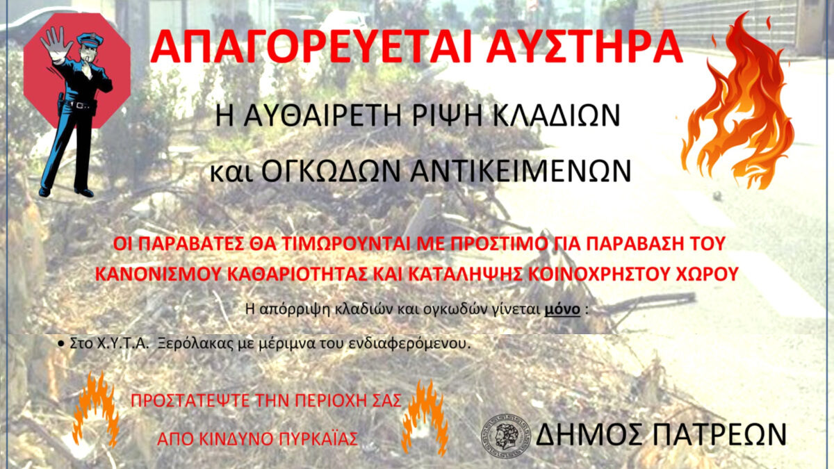 Δήμος Πατρέων: Συνεχίζεται η απαγόρευση εναπόθεσης κλαδιών κι άλλων υλικών
