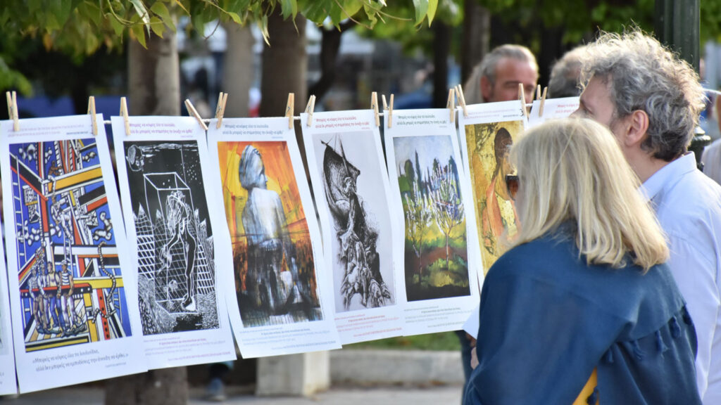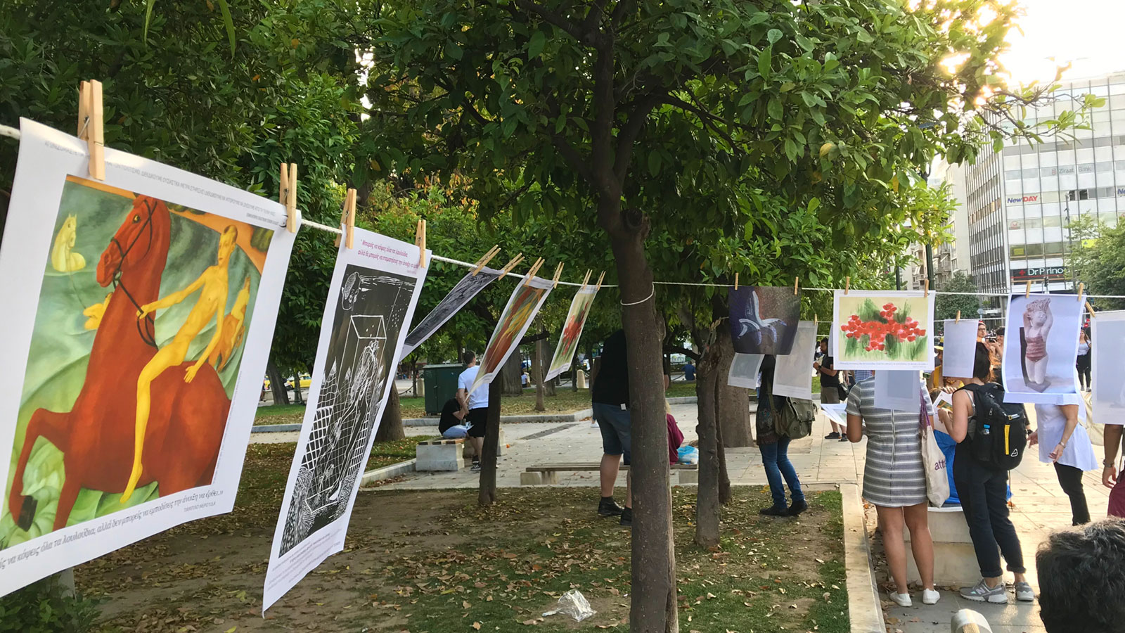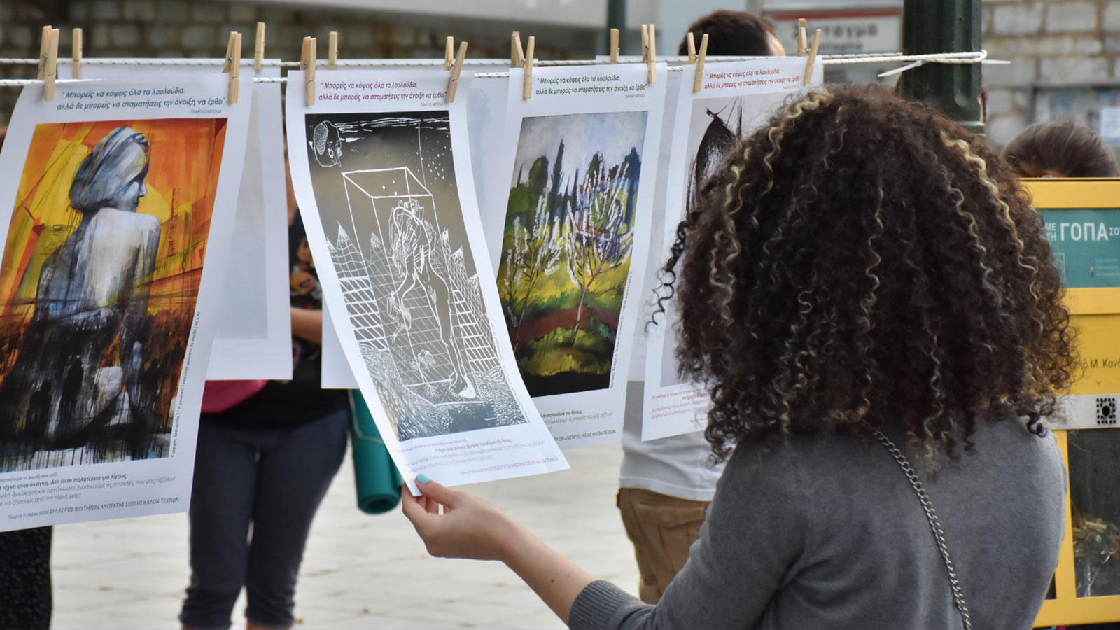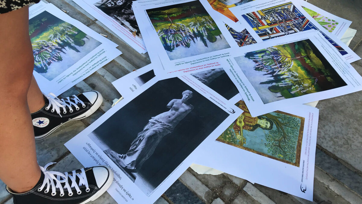 Αφού ανάρτησαν σε ψηφιακή ανατύπωση, έργα μεγάλων δημιουργών όπως του Γκογιέν, του Χαλεπά, του Θεόφιλου, του Κόλβιτς, του Ματίς κ.ά. τα δώρισαν στους περαστικούς. Πάνω τους αναγραφόταν το μήνυμα του ΕΕΤΕ: «Αγωνιζόμαστε για την Τέχνη και τον Πολιτισμό. Διεκδικούμε ουσιαστικά μέτρα στήριξης. Διεκδικούμε να μπορούμε να ζήσουμε από την τέχνη μας».