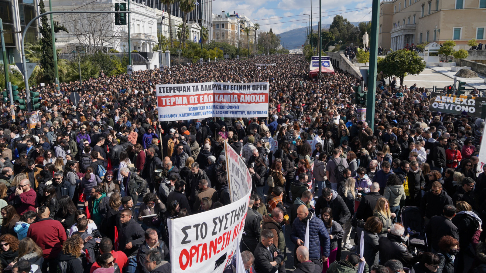 Μεγαλειώδες συλλαλητήριο στην Αθήνα με το Σύνταγμα να πλημμυρίζει με χιλιάδες λαού στέλνοντας μήνυμα ότι η μαζική συμμετοχή δεν είναι μόνο φόρος τιμής στους νεκρούς και στους συγγενείς τους, αλλά κυρίως χρέος αγώνα στις σημερινές και αυριανές γενιές, αφού η πολιτική που οδήγησε στα Τέμπη είναι εδώ.
