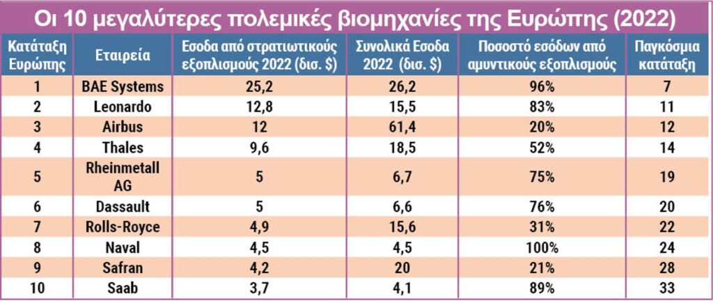 Ο συνεχιζόμενος πόλεμος στην Ουκρανία είχε διαφορετική επίδραση στις ευρωπαϊκές αμυντικές βιομηχανίες. Ορισμένες χώρες, όπως η Γαλλία και η Ιταλία, κατέγραψαν σημαντική μείωση εσόδων. Αντίθετα, τα έσοδα των γερμανικών εταιρειών αυξήθηκαν κατά 7,5%: Τέσσερις γερμανικοί κατασκευαστές αμυντικών προϊόντων κατατάσσονται μεταξύ των 100 κορυφαίων στον κόσμο: Rheinmetall, Thyssen Krupp, Hensoldt και Diehl. Η Rheinmetall, η μεγαλύτερη γερμανική βιομηχανία όπλων, βρίσκεται στην 26η θέση της κατάταξης και κατάφερε να αυξήσει τα έσοδά της κατά 10%. Η εταιρεία κατασκευάζει, μεταξύ άλλων, πυρομαχικά πυροβολικού 155 χιλιοστών, αυτοκινούμενα οβιδοβόλα και τεθωρακισμένα οχήματα. Οπλισμός που γνωρίζει μεγάλη ζήτηση με αφορμή του πολέμου στην Ουκρανία. Η εκτόξευση εσόδων είναι ακόμα μεγαλύτερη στην βιομηχανία Diehl, η οποία παράγει κατευθυνόμενους πυραύλους, καθώς και συστήματα αεράμυνας: Το 2023 κατέγραψε αύξηση εσόδων 30%.