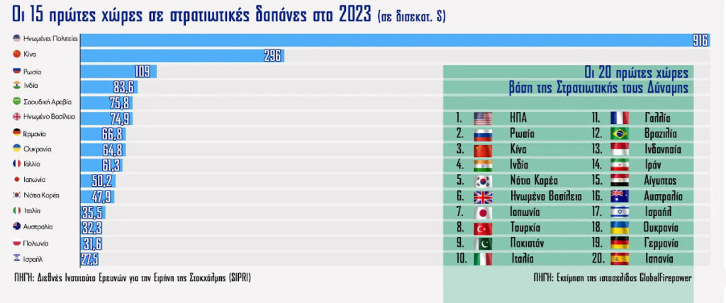 Οι ΗΠΑ είναι στην 1η γραμμή και των δύο πινάκων, μιας και διαθέτουν ισχυρότατα μονοπώλια πολεμικής βιομηχανίας. Ακολουθούν με διαφορά Κίνα και Ρωσία, αλλά εναλλάξ. Σταθερά στην 4η θέση και στους δύο πίνακες η Ινδία. Τις περισσότερες από τις 15 χώρες του πρώτου πίνακα θα τις βρούμε και στον δεύτερο.