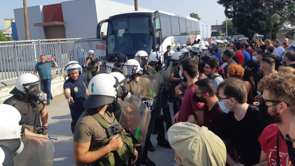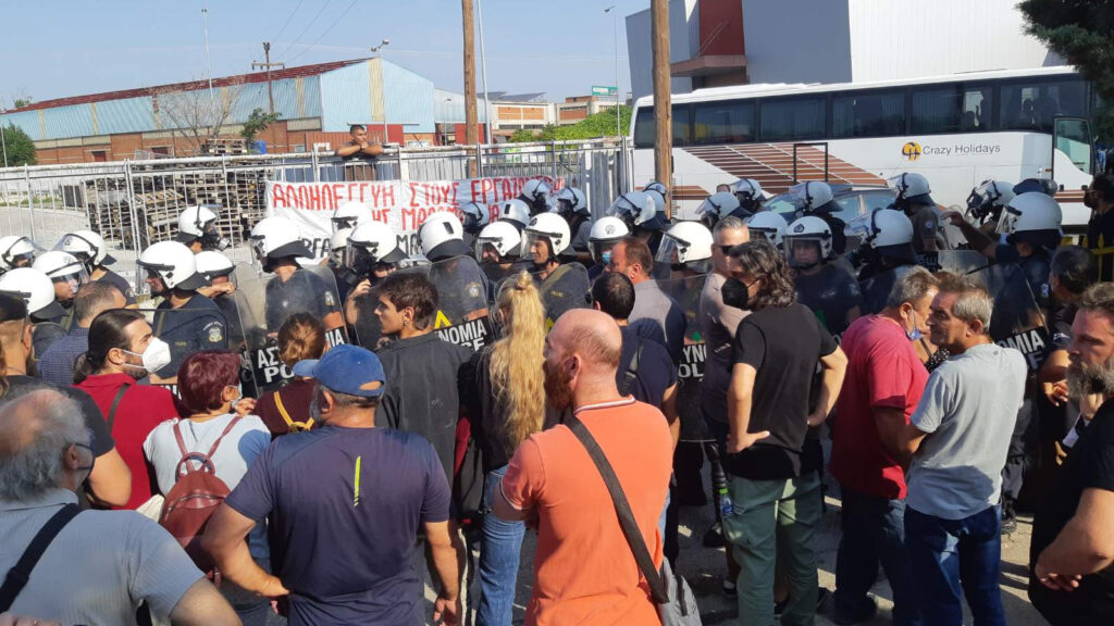 Από νωρίς στο εργοστάσιο βρίσκονται ισχυρές αστυνομικές δυνάμεις και εισαγγελέας, ενώ έχει φτάσει ένα λεωφορείο του απεργοσπαστικού μηχανισμού της εργοδοσίας.