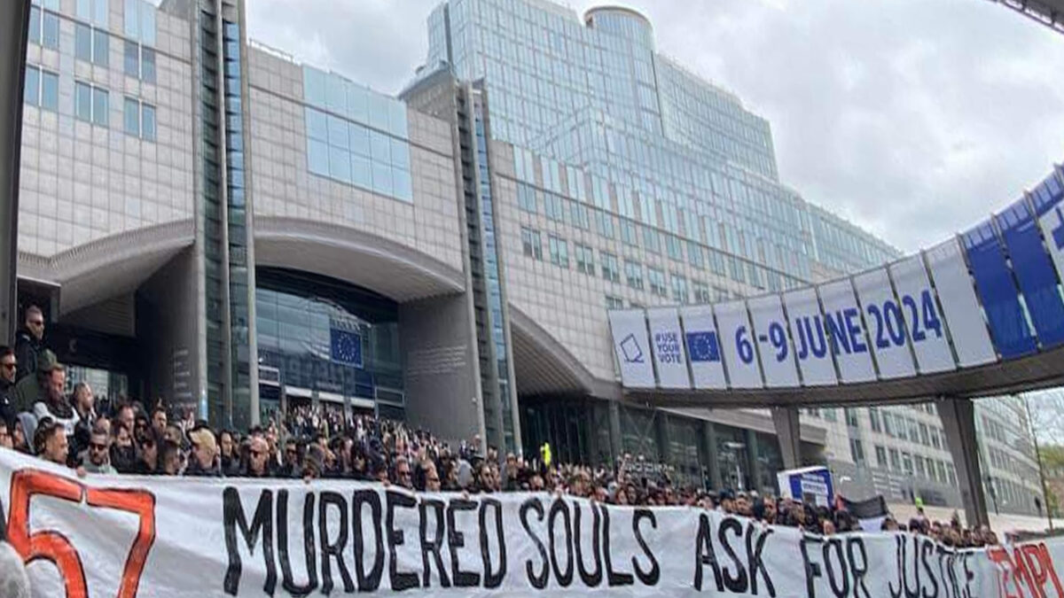 Συγκεκριμένα, οι φίλοι του «Δικεφάλου του Βορρά» ξεδίπλωσαν ένα μεγάλο πανό που έγραφε στα αγγλικά «57 ψυχές ζητούν δικαιοσύνη», δείχνοντας με αυτό τον τρόπο ότι ο ελληνικός λαός, όχι μόνο δεν ξεχνά το έγκλημα, αλλά απαιτεί να μην υπάρχει συγκάλυψη από τους θύτες.