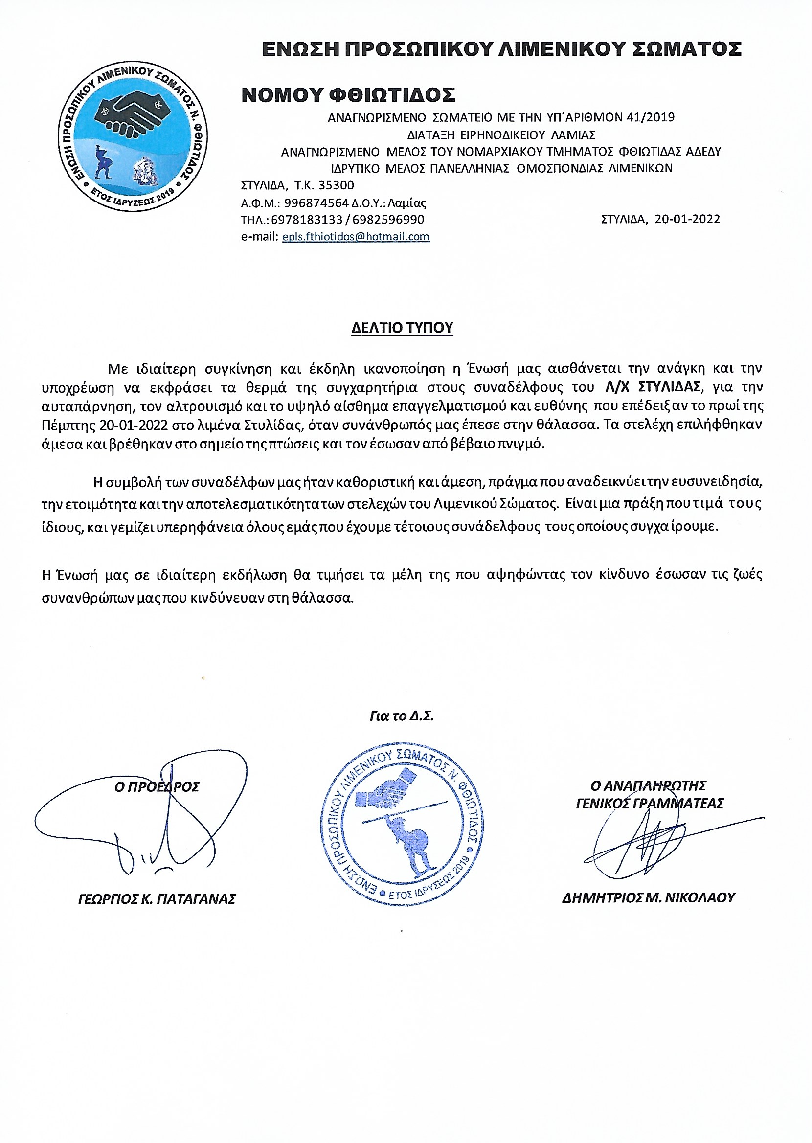 Η Ένωση Προσωπικού Λιμενικού Σώματος (ΕΠΛΣ) Φθιώτιδας με δελτίο τύπου εξέφρασε τα συγχαρητήρια της στους λιμενικούς του Λιμεναρχείου Στυλίδας για το αίσθημα επαγγελματισμού κι ευθύνης που επέδειξαν. Ταυτόχρονα ο κ. Γιαταγάνας (Πρόεδρος της Ένωσης) καλεί τους ψαράδες να είναι ιδιαίτερα προσεκτικοί τις επόμενες ημέρες που θα επικρατεί παγετός.