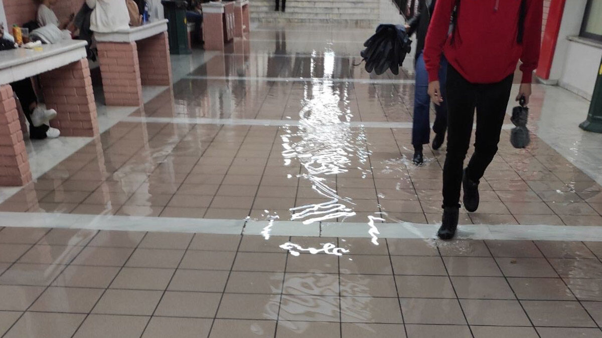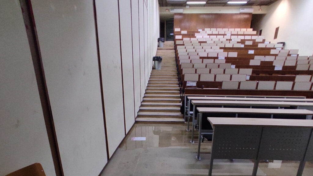 Σε μία ακόμα αποτρόπαια εικόνα γίναμε θεατές οι φοιτητές τις τελευταίες μέρες της κακοκαιρίας καθώς ταβάνια έσταζαν και τα αμφιθέατρα μας πλημμύρισαν από τις έντονες βροχοπτώσεις.
