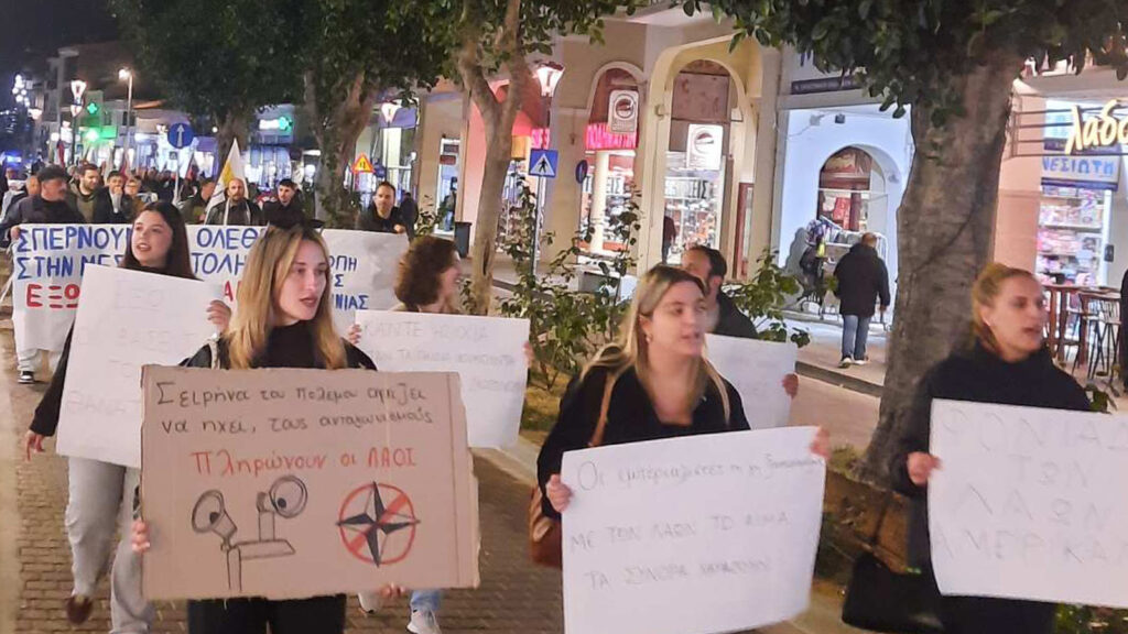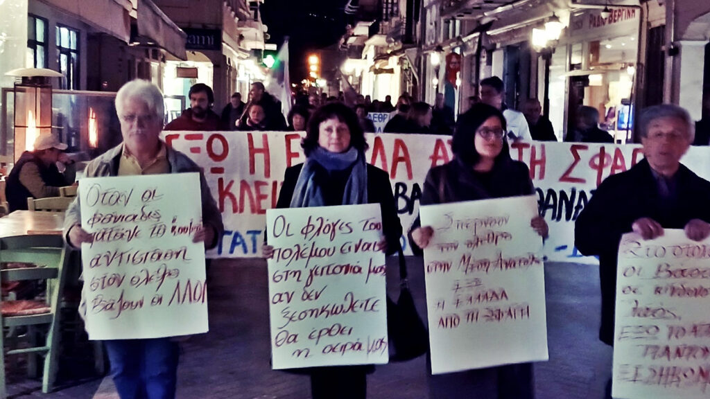 Οι συγκεντρωμένοι καταδίκασαν τα προσχήματα της «υπεράσπισης της άμυνας της Κύπρου» που αναπαράγει η κυβέρνηση για την αποστολή φρεγατών και μαχητικών αεροσκαφών στο νησί, αναδεικνύοντας πως ο πραγματικός ρόλος των ελληνικών δυνάμεων εκεί είναι η προστασία των βρετανικών βάσεων και των ΝΑΤΟϊκών υποδομών. Απαίτησαν έτσι, να απεμπλακεί η Ελλάδα από τον πόλεμο, να ξεκουμπιστούν οι αμερικανονατοϊκές βάσεις από την περιοχή και τη χώρα αλλά και να γυρίσουν πίσω οι φρεγάτες, τα αεροπλάνα και η πυροβολαρχία.