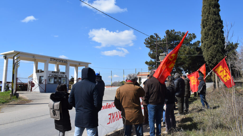 Παρέμβαση έξω από το στρατόπεδο «Γιαννούλη» στην Αλεξανδρούπολη πραγματοποίησαν νωρίτερα σήμερα μέλη των οργανώσεων Έβρου του ΚΚΕ και της ΚΝΕ ενάντια στον ιμπεριαλιστικό πόλεμο και την εμπλοκή της χώρας σε αυτόν.