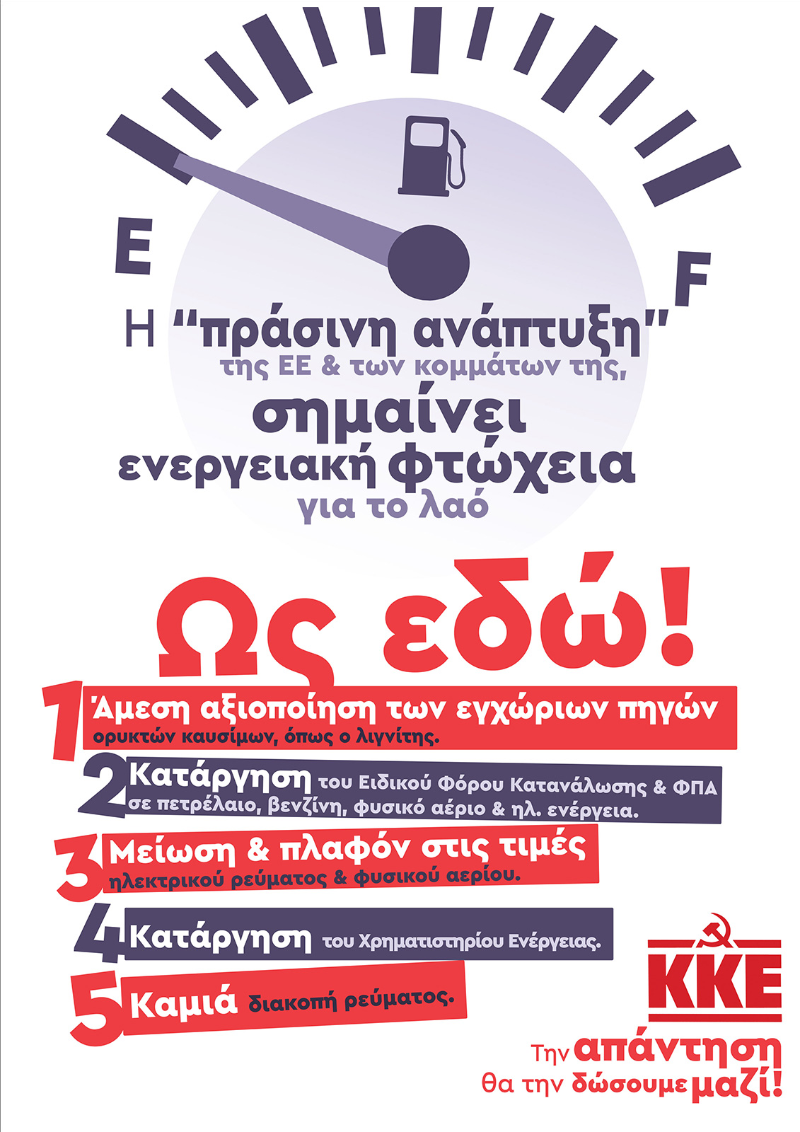 Η δεύτερη αφίσα εστιάζει στην ακρίβεια στην Ενέργεια, με σύνθημα «Η “πράσινη ανάπτυξη” της ΕΕ και των κομμάτων της, σημαίνει ενεργειακή φτώχεια για τον λαό. Ως εδώ!».